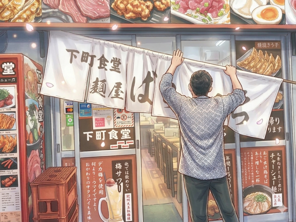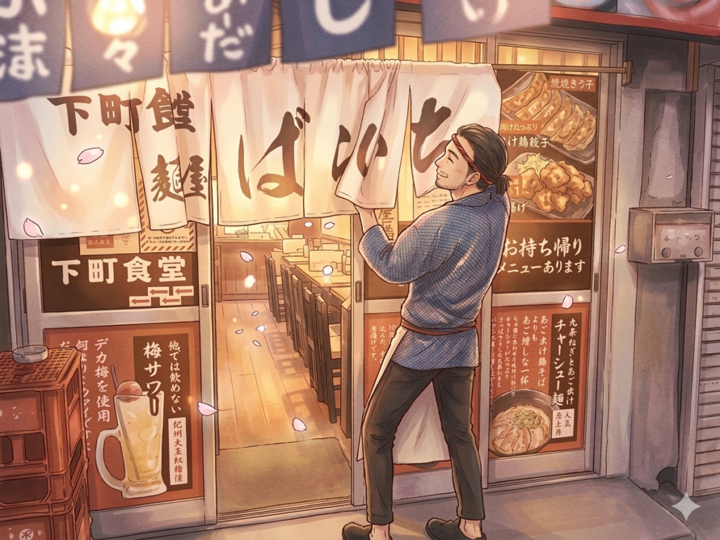 暖簾を出して夜営業のスタートです。