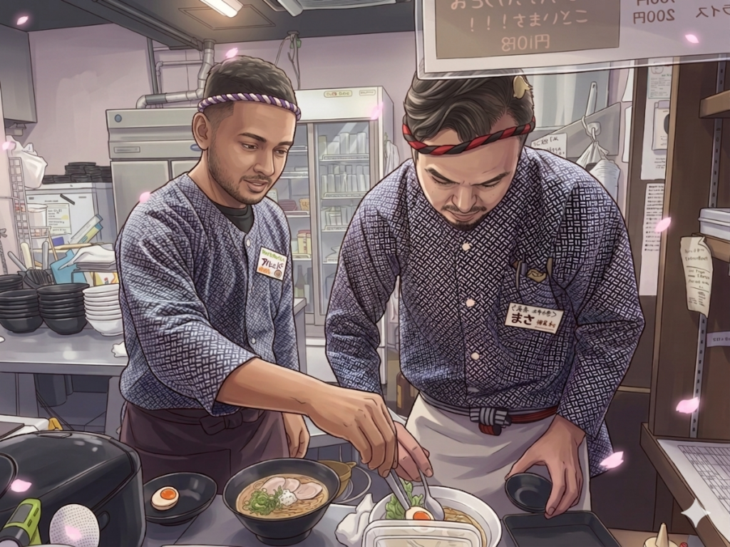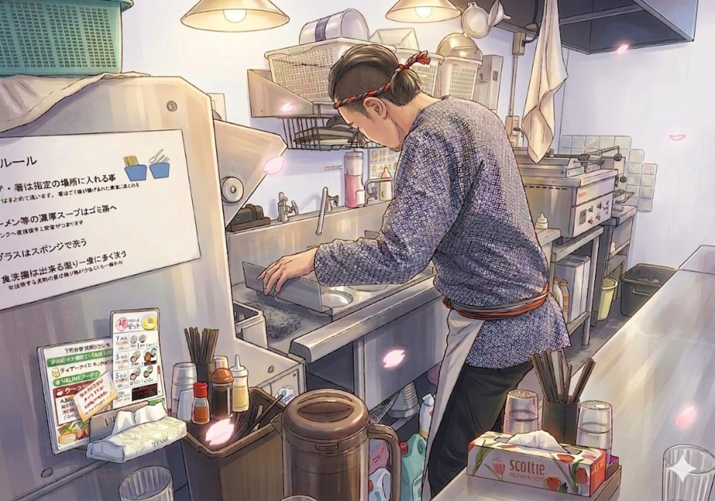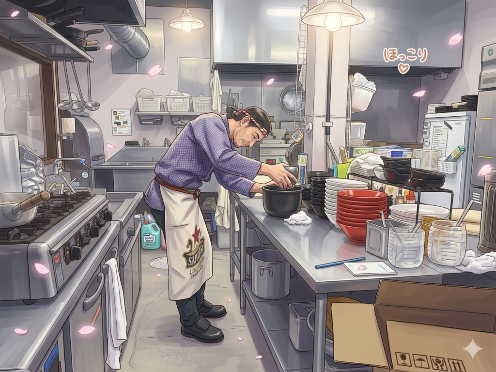 ラーメンスープの温めや、炊飯、味玉や刻みネギ、海苔などのトッピングの準備などなど