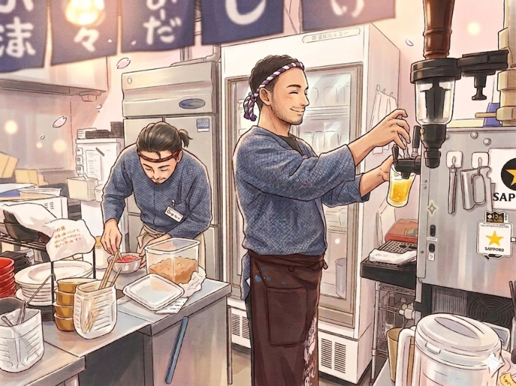 お酒におつまみ、ラーメンと、オーダーが重なるとかなり忙しいです。